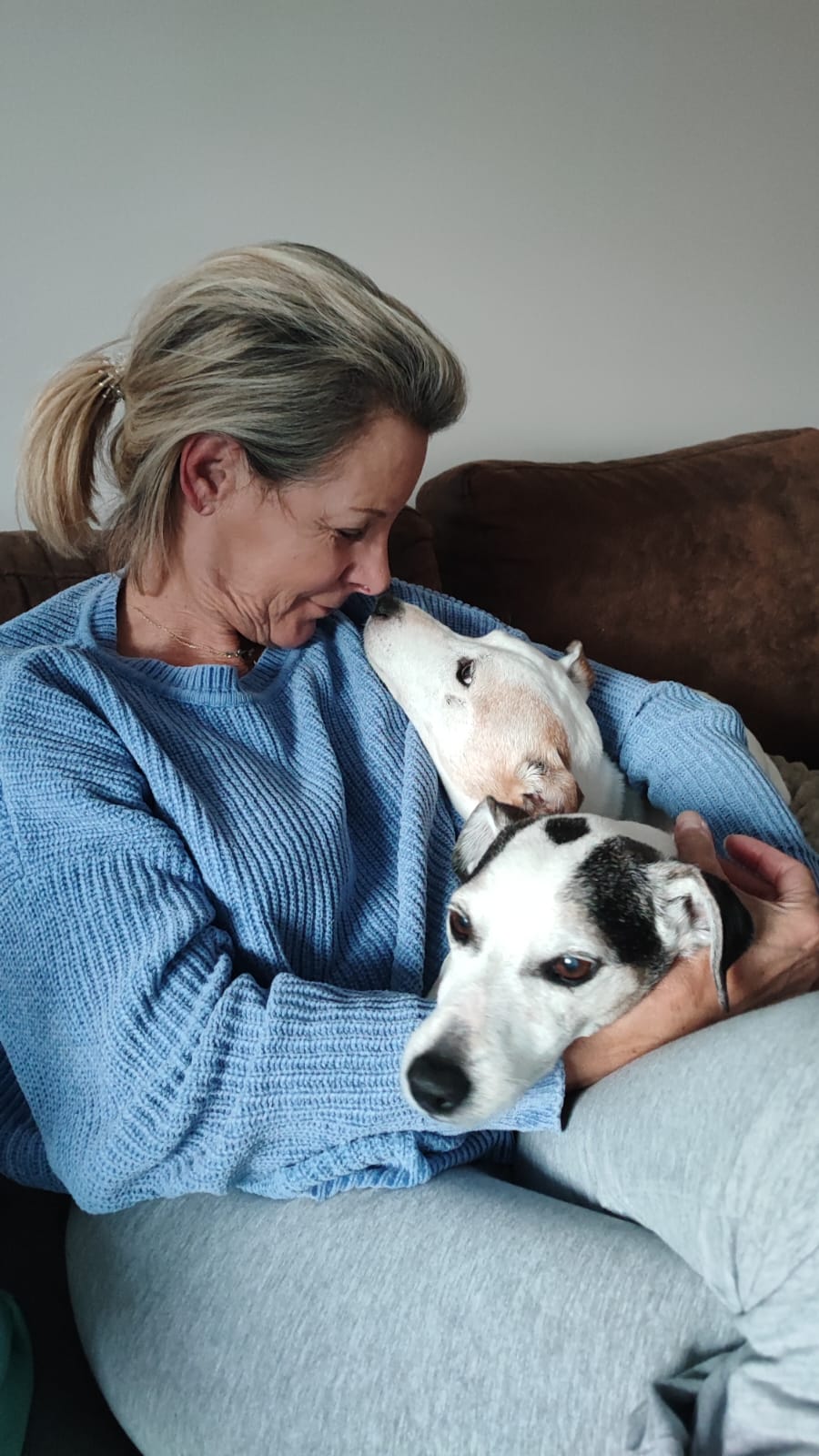 Un lien de pure confiance unit Dexter à son maître. Il se place dans les bras de son maître avec l'assurance d'un chien qui sait parfaitement qu'il sera toujours là.